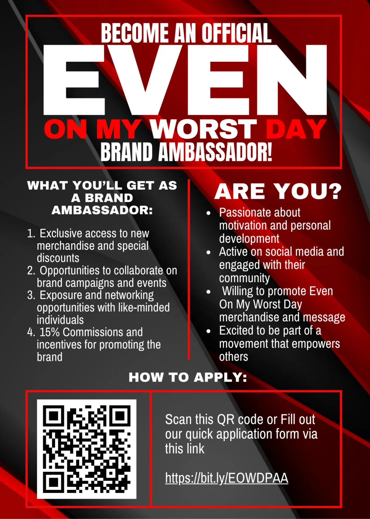 Are you passionate about inspiring others to push through tough times and turn their worst days into their greatest victories? Even On My Worst Day is looking for motivated individuals to represent our brand and spread the message of resilience, perseverance, and success. Join Here or you can tap on the photos below to register.